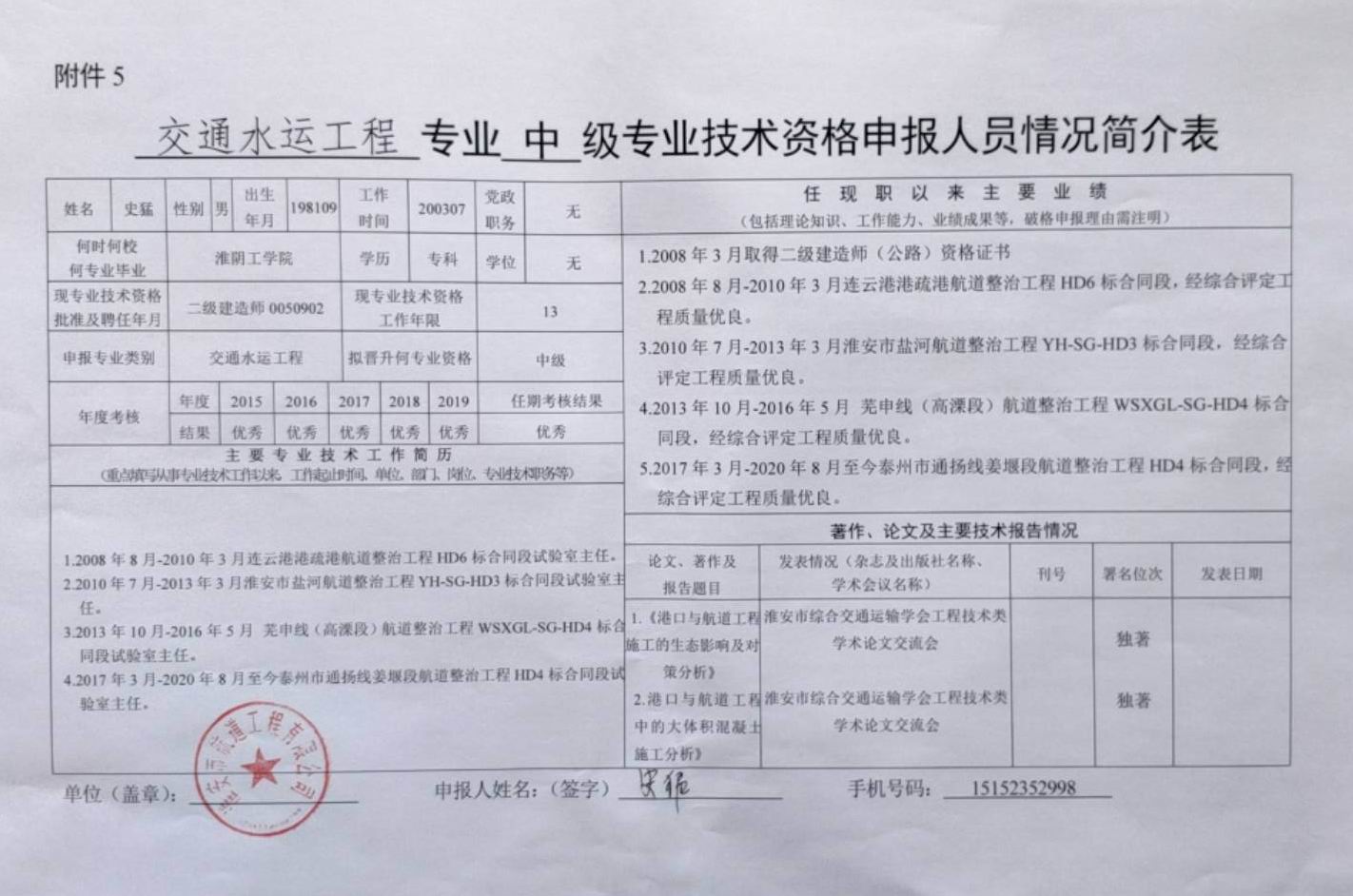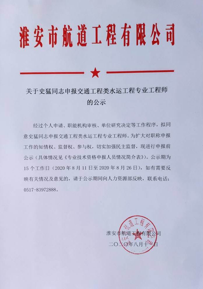 關(guān)于史猛同志申報(bào)交通工程類(lèi)水運(yùn)工程專(zhuān)業(yè)工程師的公示
